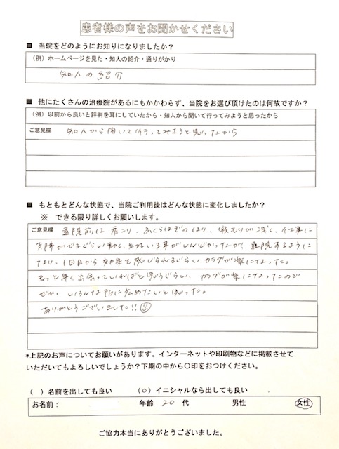 仕事に支障が出るくらいしんどかったが、通院1回目から効果を感じられるくらいカラダが楽になった。